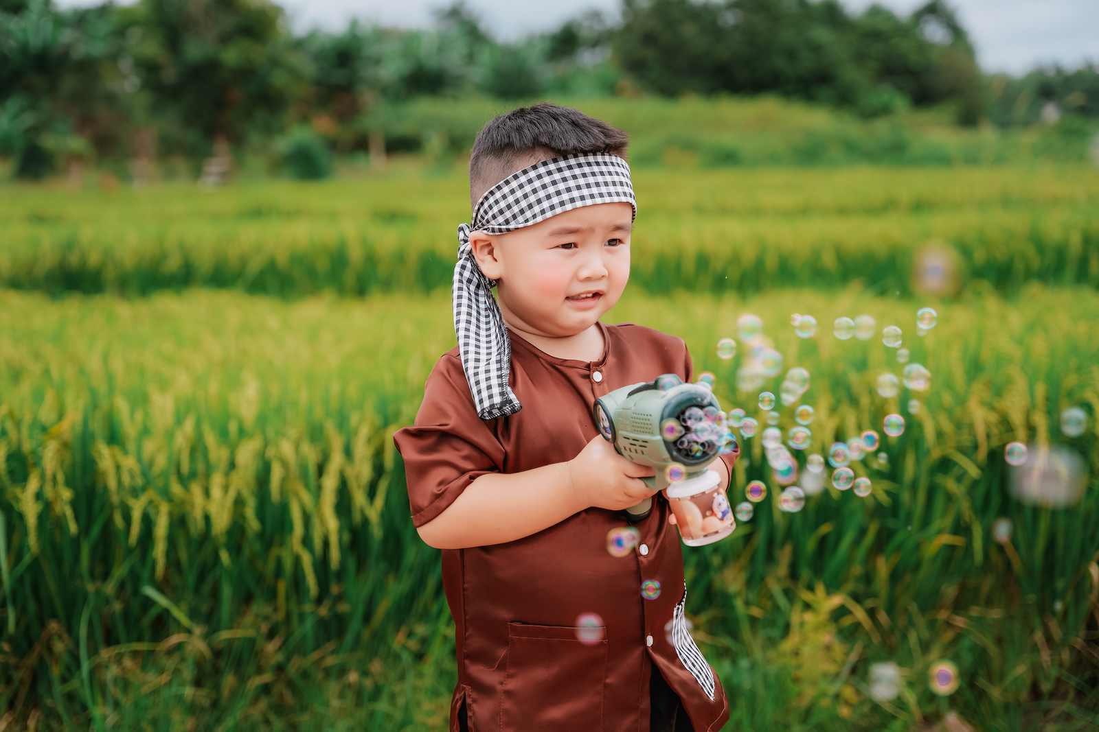 Giữa cánh đồng lúa xanh mướt, bé Chit diện áo bà ba giản dị, tay cầm súng bắn bong bóng với những ngây ngô thuở nhỏ. Khoảnh khắc hồn nhiên ấy như gợi lại ký ức trong trẻo của tuổi thơ miền quê – nơi tiếng cười trẻ nhỏ hòa cùng hương đồng gió nội, tạo nên bức tranh bình yên và đầy sức sống.