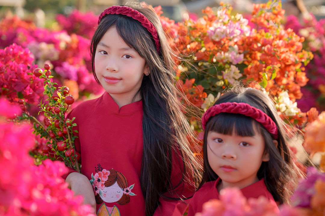 Giữa sắc hoa rực rỡ của ngày Tết, hai chị em diện áo dài đỏ truyền thống, tay cầm bao lì xì với ánh mắt rạng rỡ và dịu dàng. Bức ảnh không chỉ lưu giữ vẻ đẹp hồn nhiên, mà còn là hình ảnh gắn kết yêu thương – như một lời chúc xuân an lành, ấm áp và sum vầy.